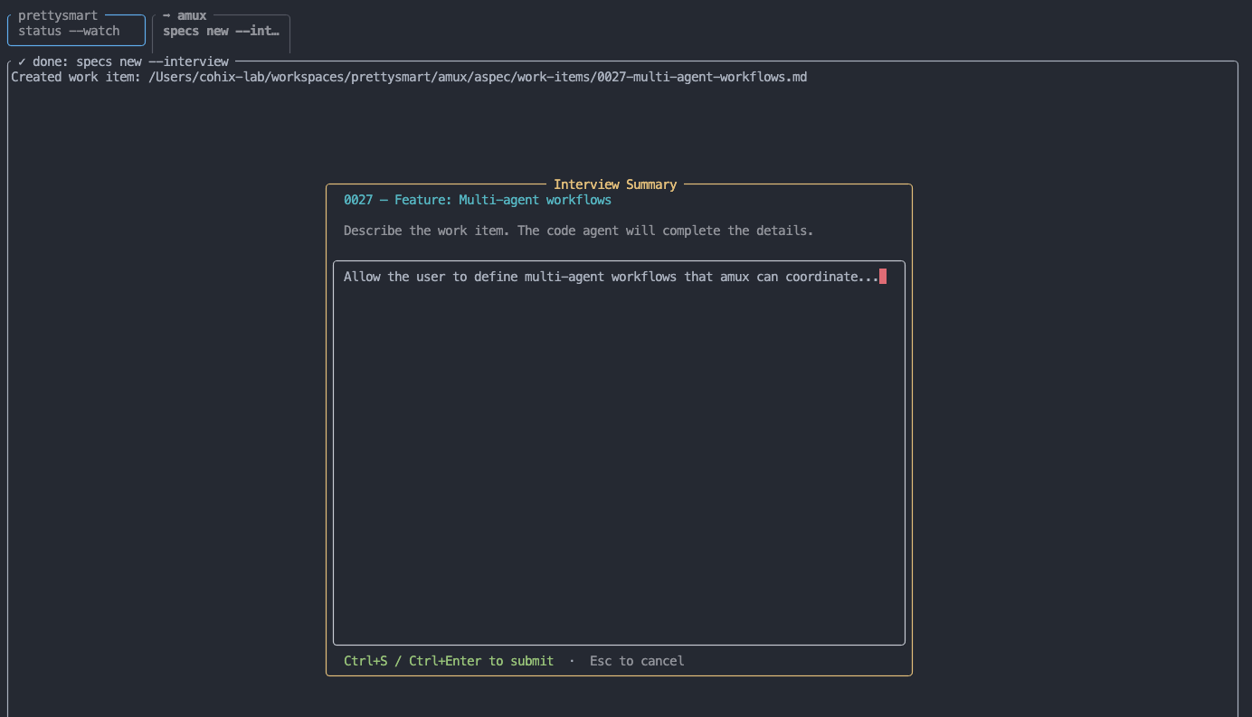 --interview is the one I've been wanting for a while. When you need to create a new work item, amux will run your agent based on a short description you provide and expand it into a first draft of the spec — what problem you're solving, what it should do in edge cases, what the constraints are. It fills in the spec Markdown so you can refine it. The result is a much more complete work item without having to write it from scratch. I've found it's particularly useful when I know roughly what I want but haven't thought through the details yet — the agent surfaces things I would have left blank or forgotten. The first draft isn't always exactly what you want, but editing a good starting point is much faster than starting from scratch.