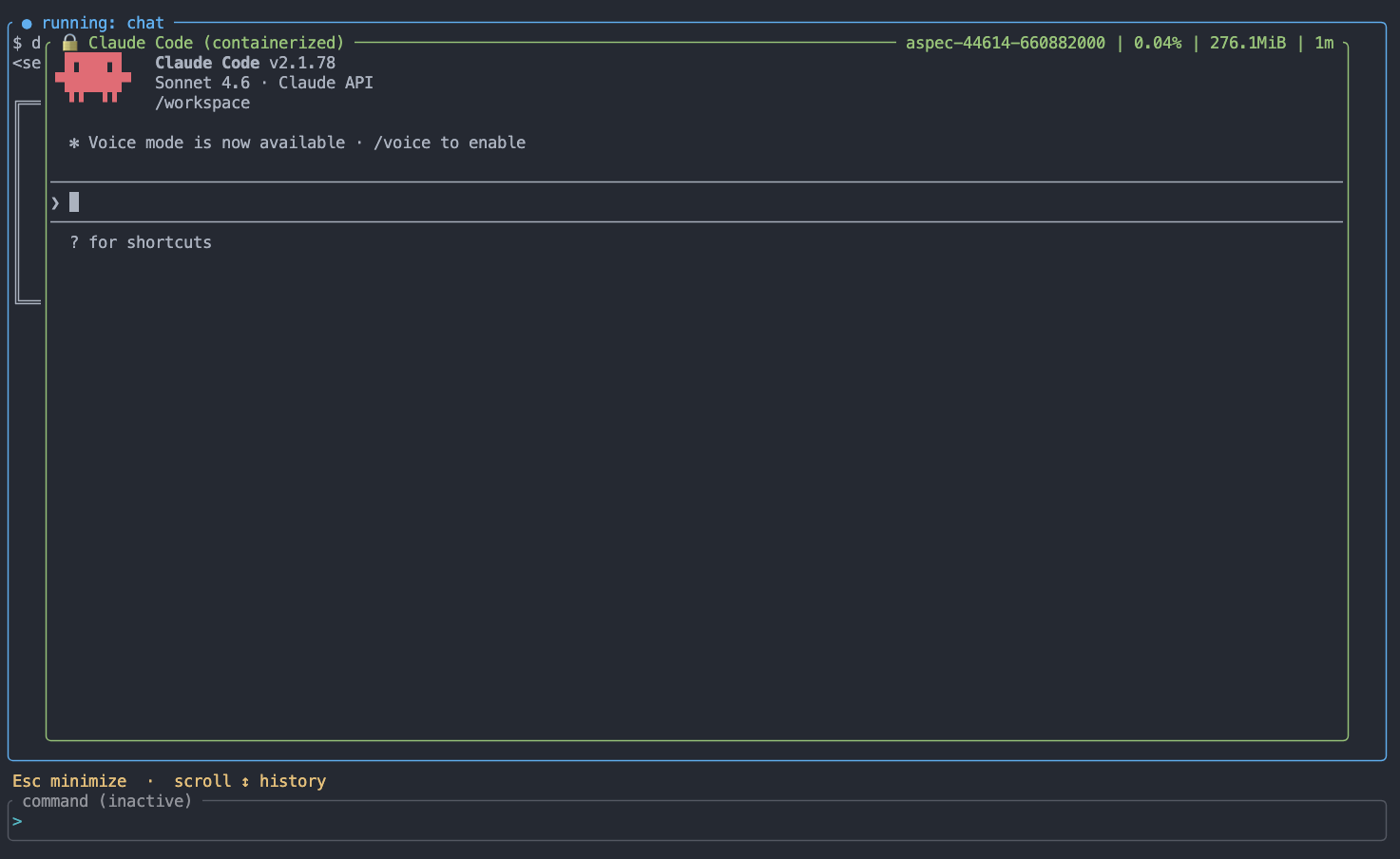 The idea with aspec is that the right abstraction for agentic development isn't a better chat interface — it's a better contract between the developer and the agent. A project's aspec gives your agent the context it needs to make good decisions (more of the time), and containerization gives you higher confidence to let agents be more autonomous. The two parts are intended to reinforce one another!