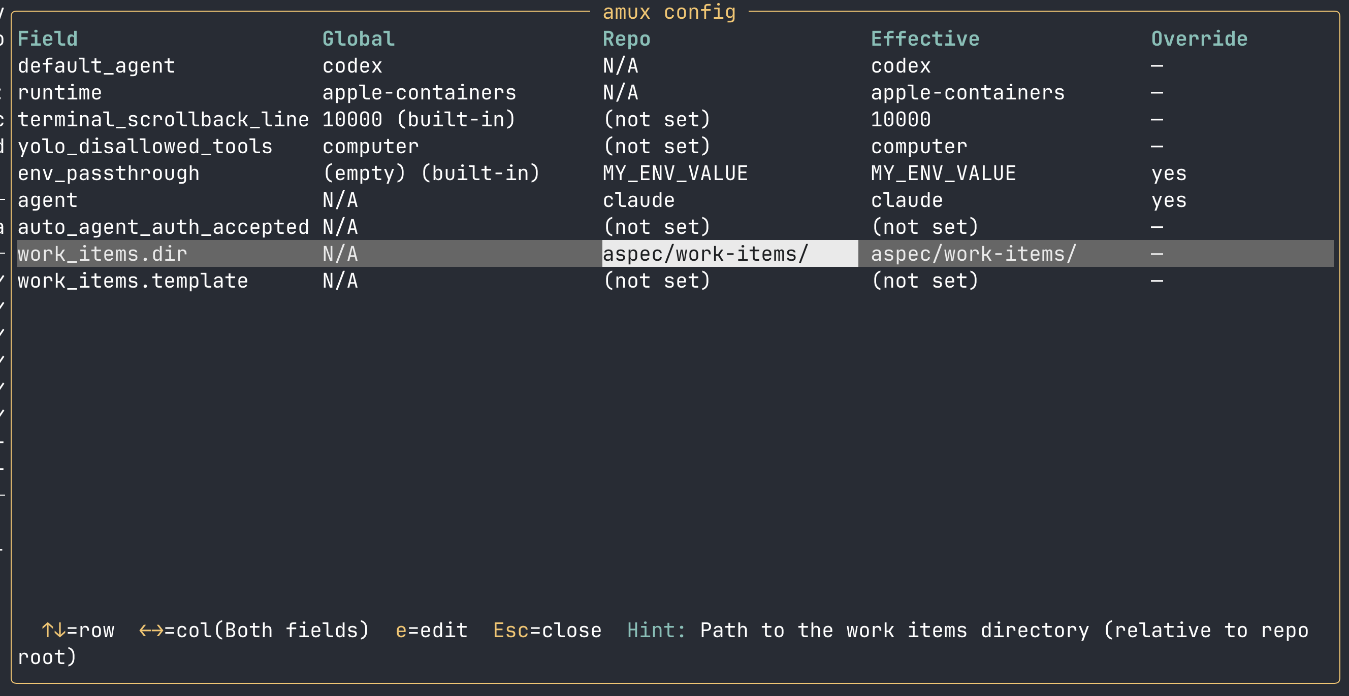 Once set, every amux command that touches work items uses the configured paths. This ensures you can use all of amux's features even if you haven't adopted the aspec pattern.